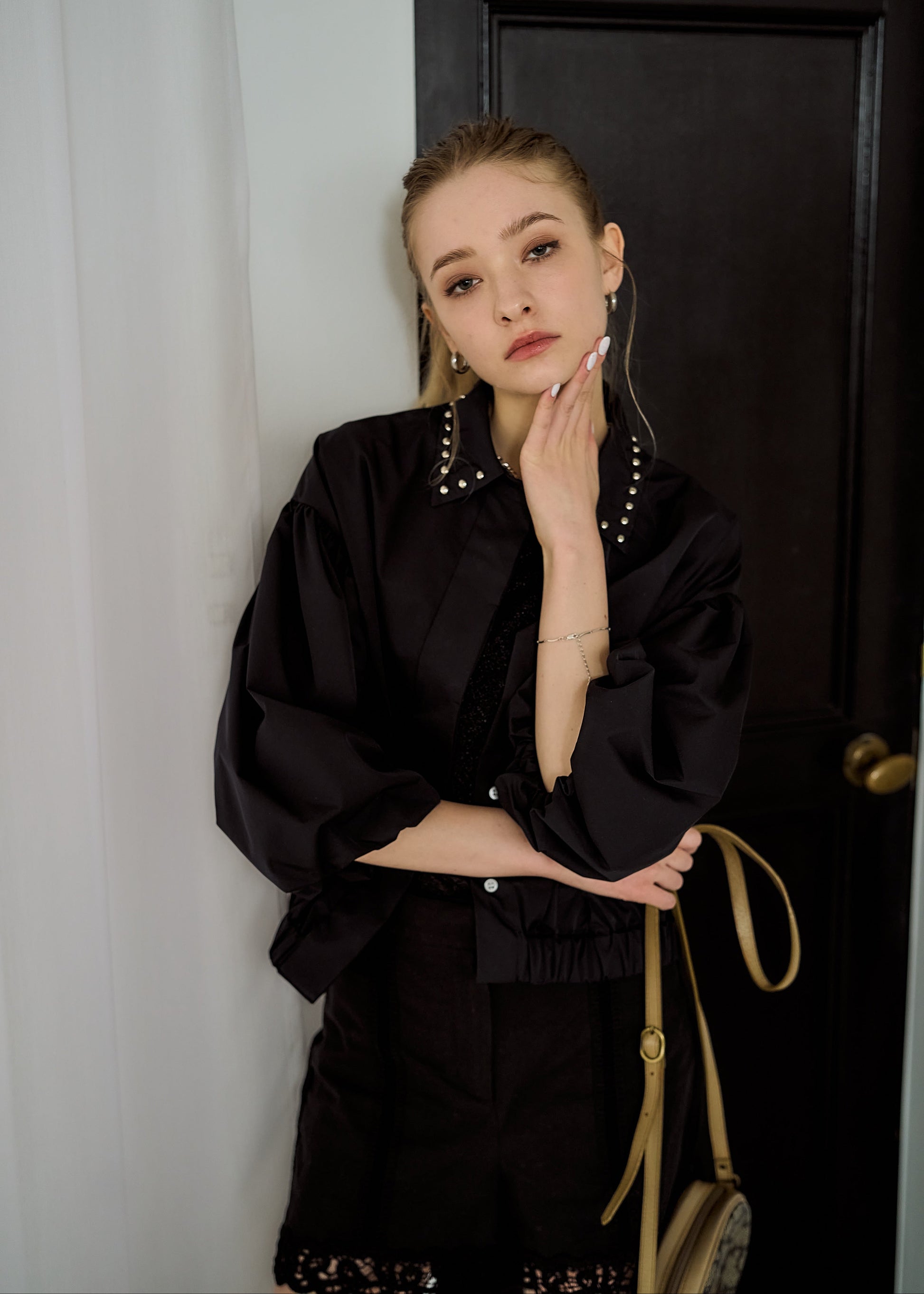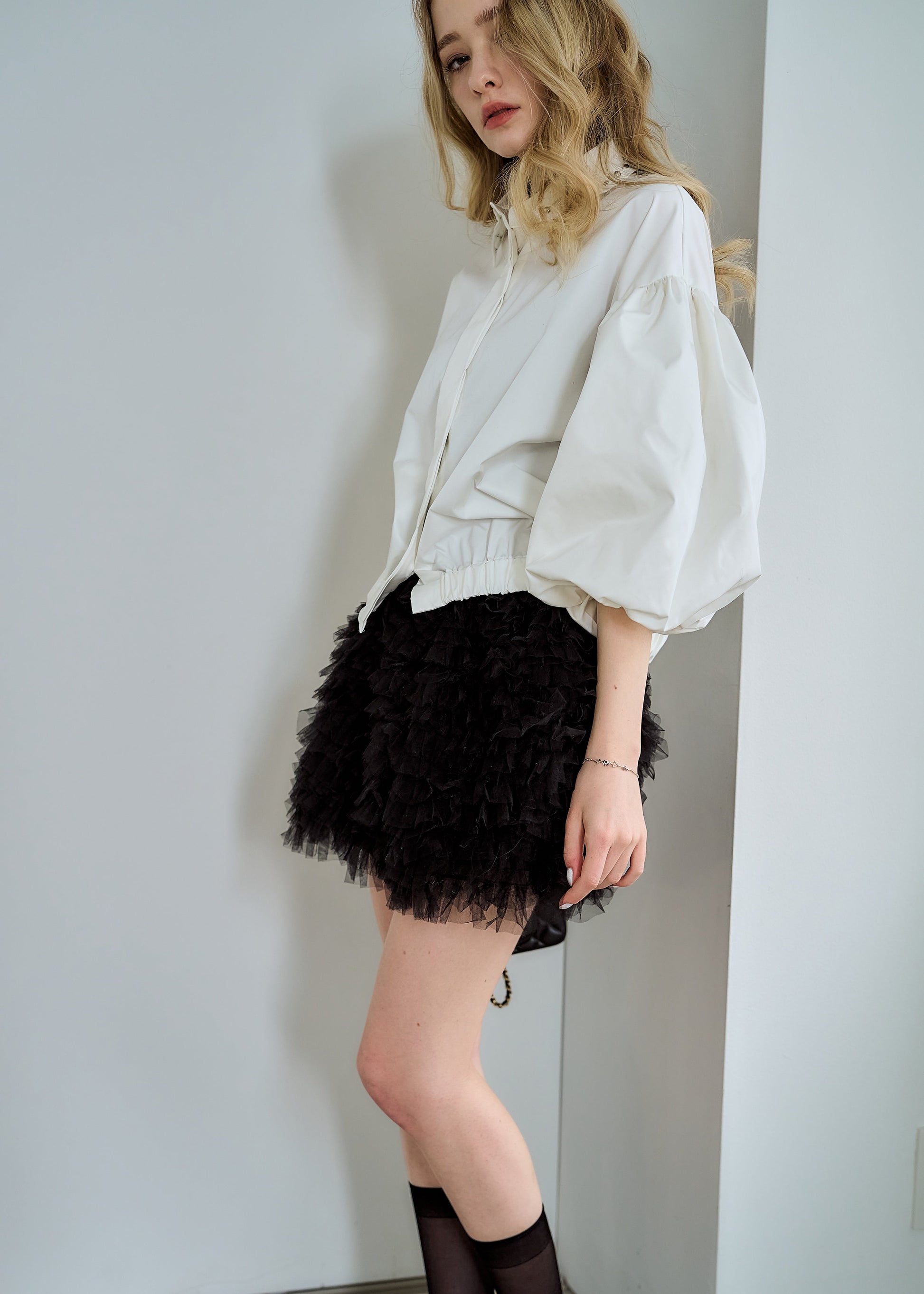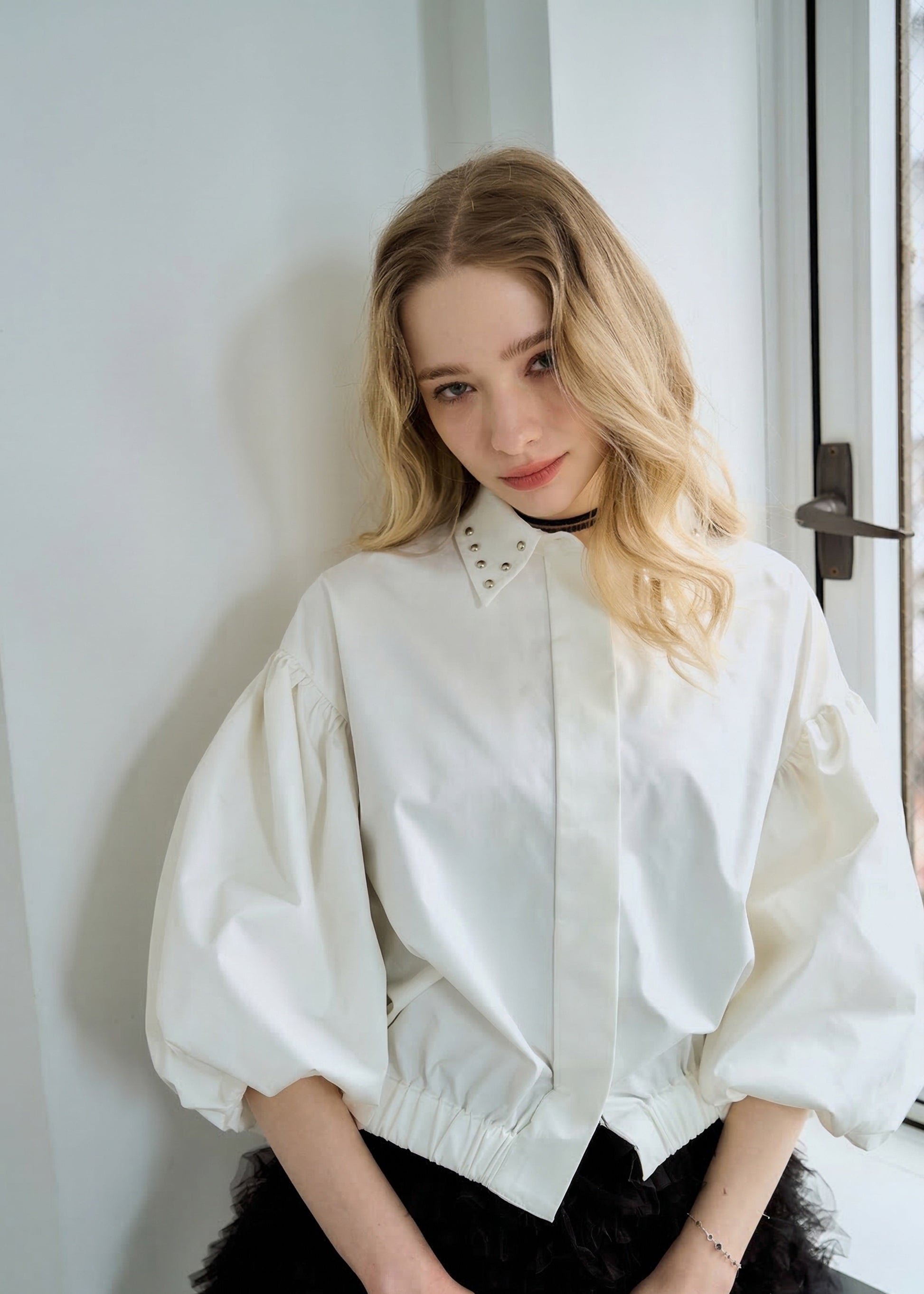 スタッズカラー・バルーンスリーブクロップドシャツ